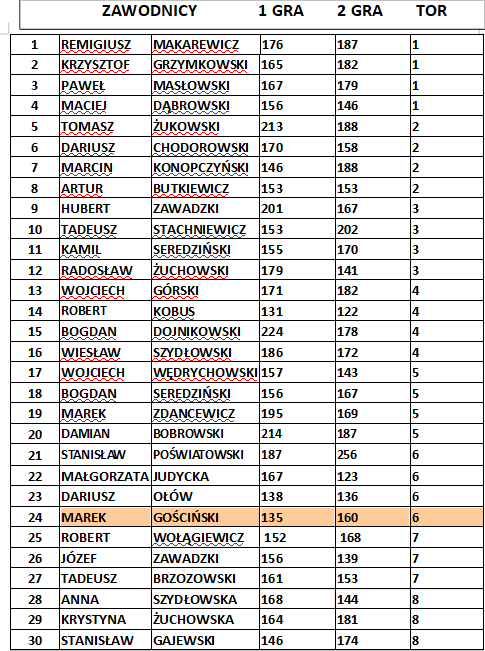 Smarowanie byÅ‚o dosyć krótkie, co bardziej utrudniÅ‚o grÄ™. W pierwszej fazie zawodnicy - po czterech na torze, rozegrali po 2 gry. Dwóch najlepszych zawodników z toru przechodziÅ‚o dalej.