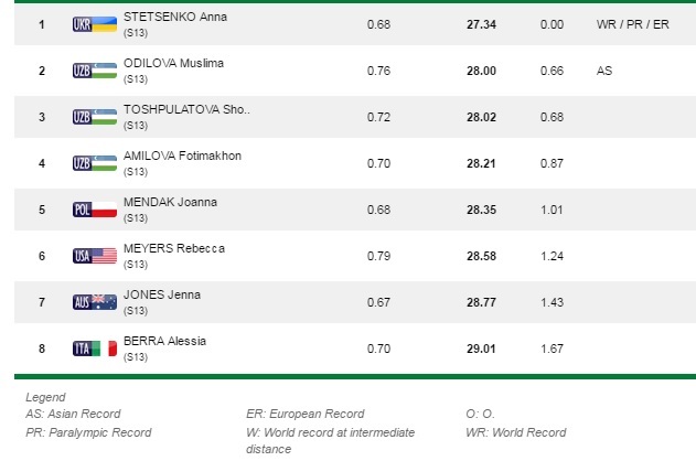 FinaÅ‚owy wyÅ›cig na 50 m dowolnym byÅ‚ już popisem Anny Stecenko, która o cztery setne pobiÅ‚a 20-letni rekord Niemki Yvonne Hopf z Atlanty i aż o 66 setnych wyprzedziÅ‚a nowÄ… rekordzistkÄ™ Azji OdiÅ‚owÄ…, za którÄ… finiszowaÅ‚y dwie kolejne pÅ‚ywaczki z Uzbekistanu i Polka.
