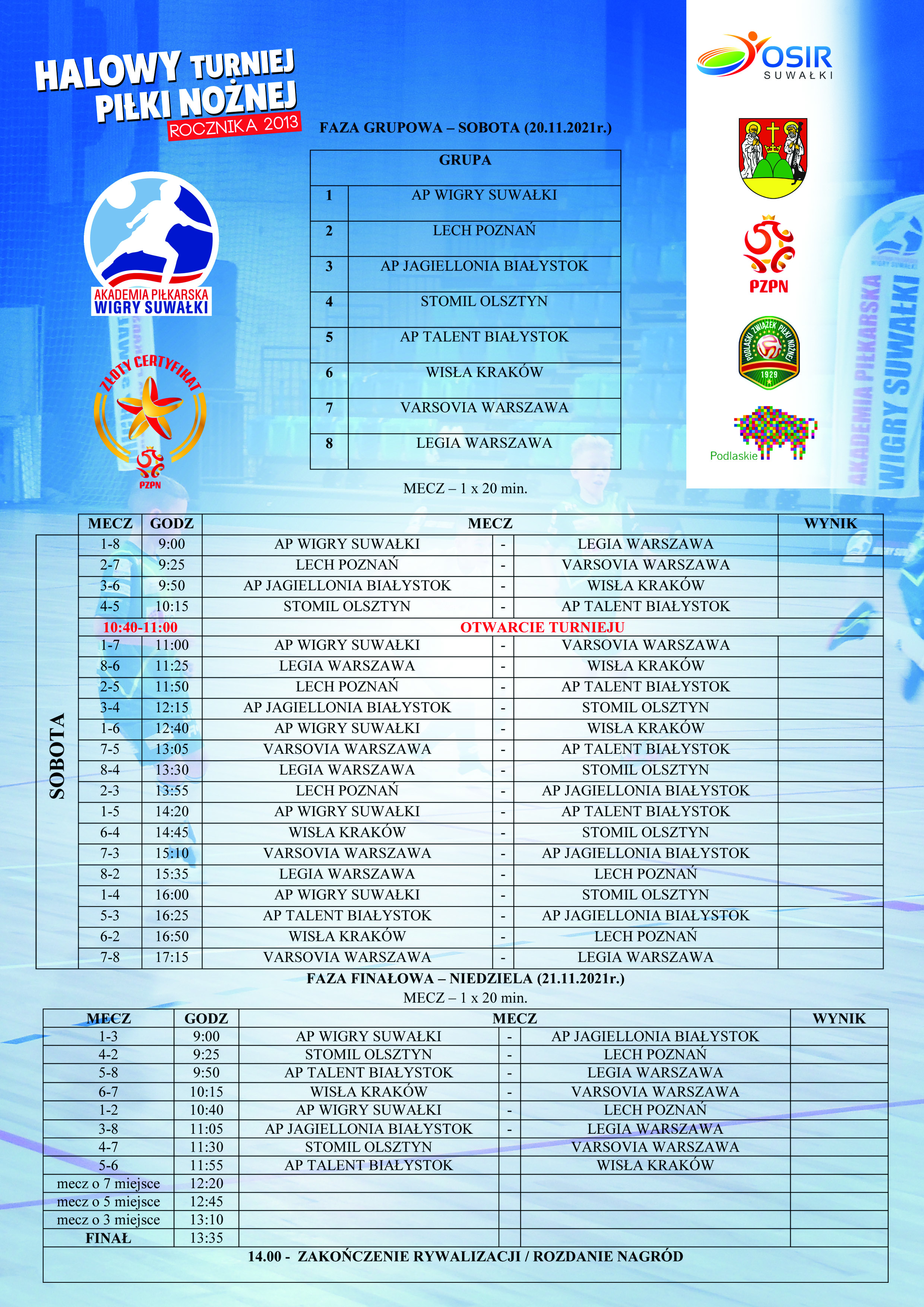 W tÄ™ sobotÄ™ i niedzielÄ™, 20 i 21 listopada w SuwaÅ‚ki Arenie rozegrany zostanie Halowy Turniej PiÅ‚ki Nożnej Rocznika 2013.Â