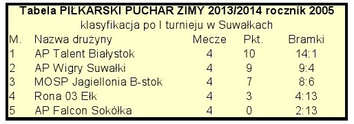 W niedzielę 17 listopada 2013 na hali przy ZS nr 3 w Suwałkach odbył się inauguracyjny turniej rozgrywek rocznika 2005 o Piłkarski Puchar Zimy 2013/2014.