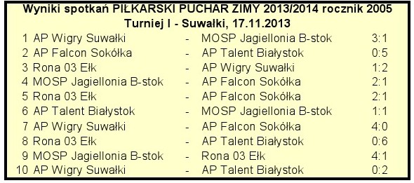 Rywalizacja stała na wysokim poziomie, nie brakowało pięknych akcji i bramek, emocji i walki o zwycięstwo do ostatniej sekundy. Poniżej prezentujemy wyniki, tabelę i uczestników turnieju. Przypomnijmy, że był to pierwszy z zaplanowanych sześciu turniejów Piłkarskiego Pucharu Zimy w tej kategorii wiekowej. Kolejny turniej rocznika 2005 odbędzie się 01 grudnia 2013 w Białymstoku, a gospodarzem będzie AP Talent Białystok. W niedzielę 24 listopada 2013 na hali OSiR w Suwałkach rywalizację o PIŁKARSKI PUCHAR ZIMY rozpoczną natomiast zawodnicy urodzeni w 2004r.