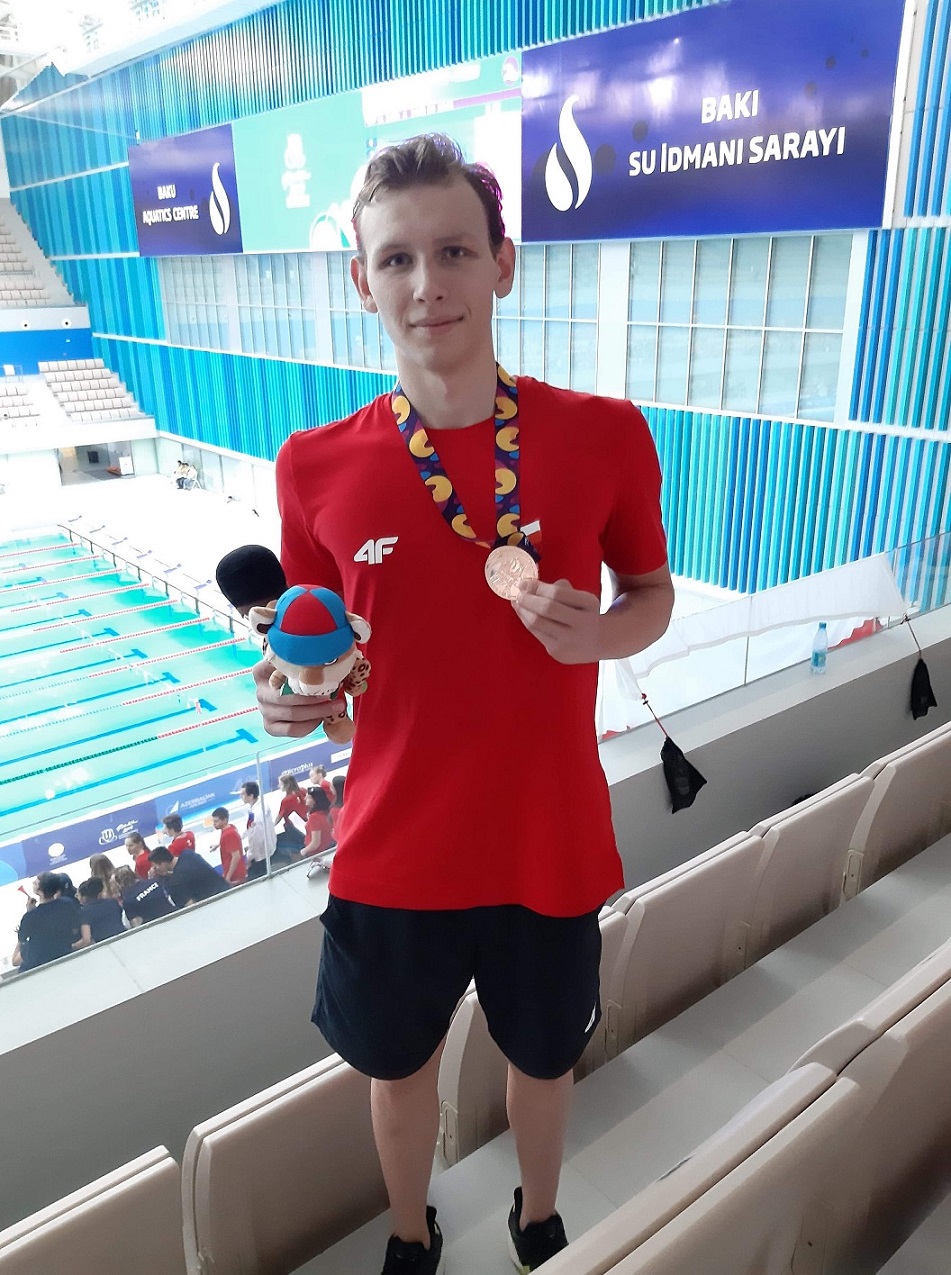 Sympatyczną niespodziankę fachowcom i kibicom sprawił dzisiaj w Baku 15-letni Filip Kosiński. W finale wyścigu na 200 m stylem grzbietowym młodszy o rok od przeciwników zawodnik MUKS Olimpijczyk Suwałki zajął 3. miejsce.