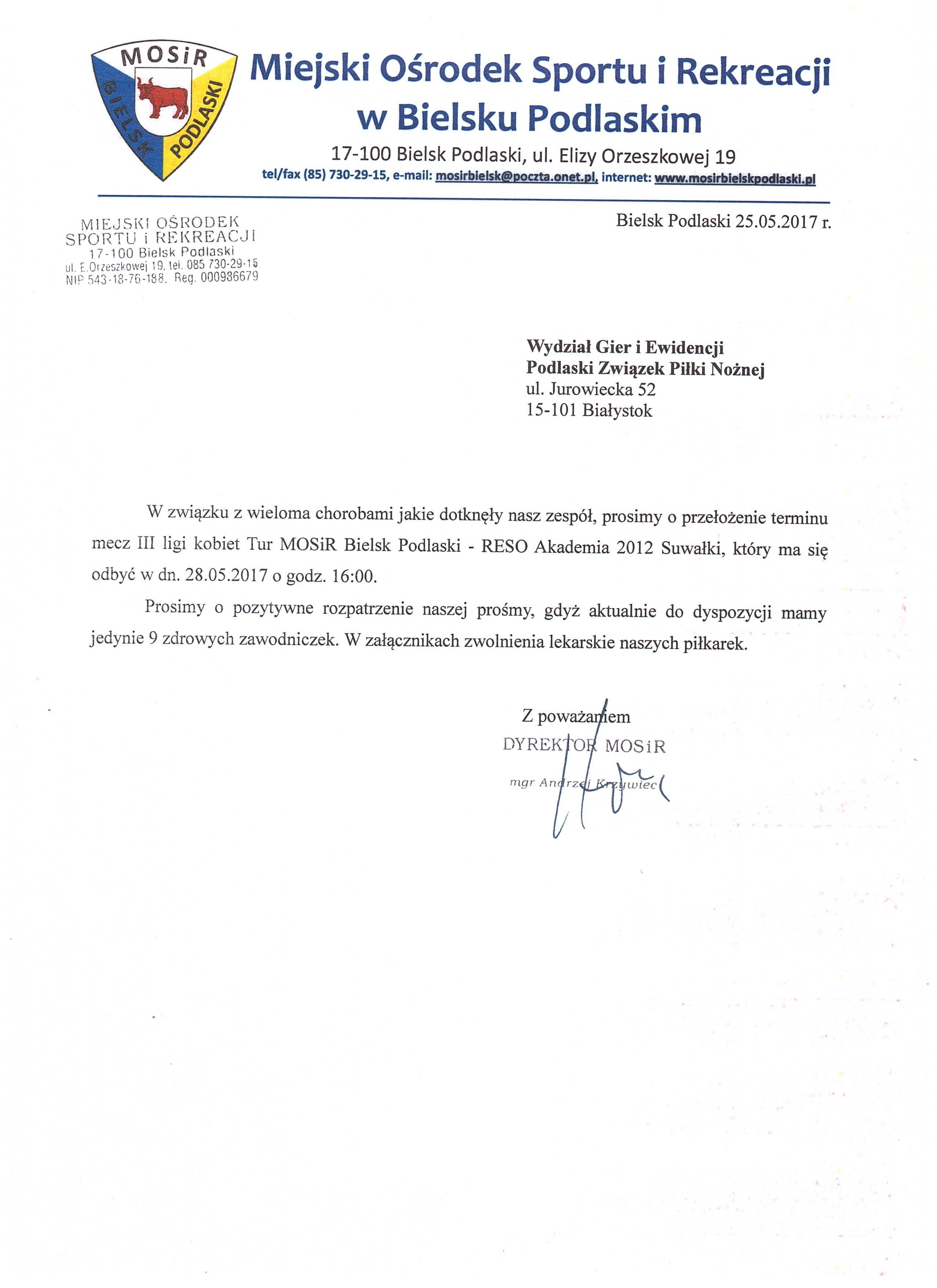 Wydział Gier i Ewidencji po konsultacji z przewodniczącym piłki kobiecej Panem Arkadiuszem Studniarkiem postanowił przełożyć mecz z uwagi na przedstawienie zaświadczeń lekarskich zawodniczek Tur MOSiR Bielsk Podlaski. Oparliśmy się o Regulamin Rozgrywek Mistrzowskich Podlaskiego Związku Piłki Nożnej w sezonie 2016/2017 w rozdziale 6. paragraf 19, punkt 6.