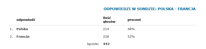 Z naszej strony natomiast należy się odpowiedź na pytanie, które postawiliśmy w naszej przedmeczowej sądzie. Na awans Francji do ćwierćfinału postawiła nieznaczna większość jej uczestników.