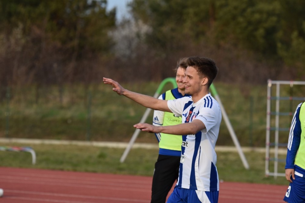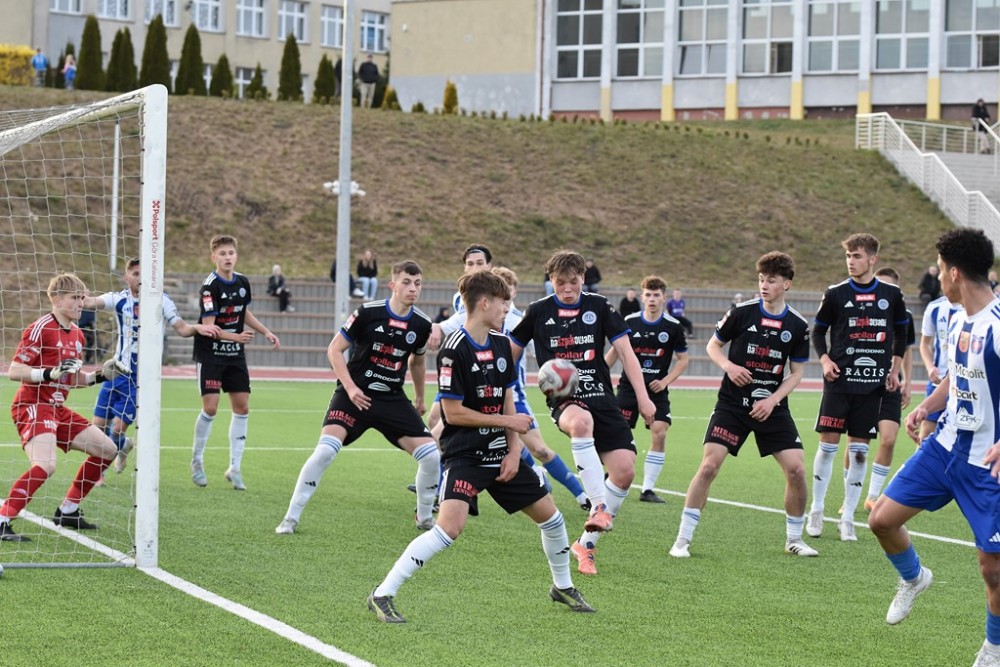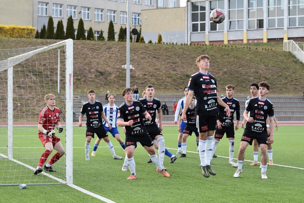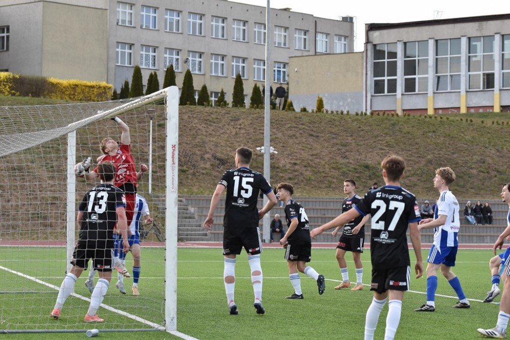 W samej końcówce trzy kolejne rzuty rożne prawą nogą bił Łukasz Trąbka. Za trzecim razem podkręcił piłkę wyżej i wpadła ona za kołnierz Maciejowi Aleksandrowiczowi (na górnym zdjęciu), który w przerwie zmienił Kubę Iwanowskiego.
