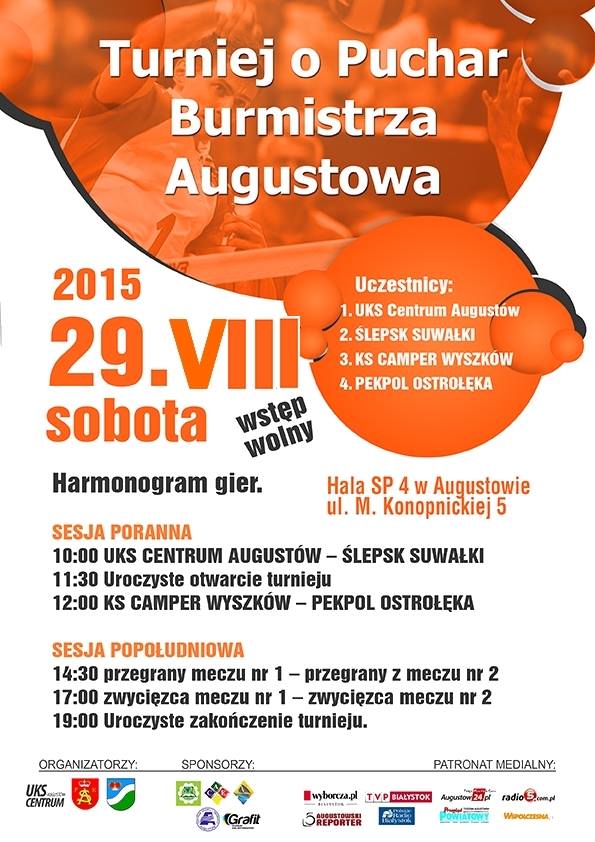 Trzy zespoły I ligi: Camper Wyszków, KPS Siedlce i Ślepsk Suwałki oraz II-ligowy UKS Centrum Augustów zagrają w sobotę w turnieju siatkarzy o Puchar Burmistrza Augustowa. Dla wszystkich drużyn będzie to pierwszy sprawdzian przed inauguracją sezonu 2015/16.