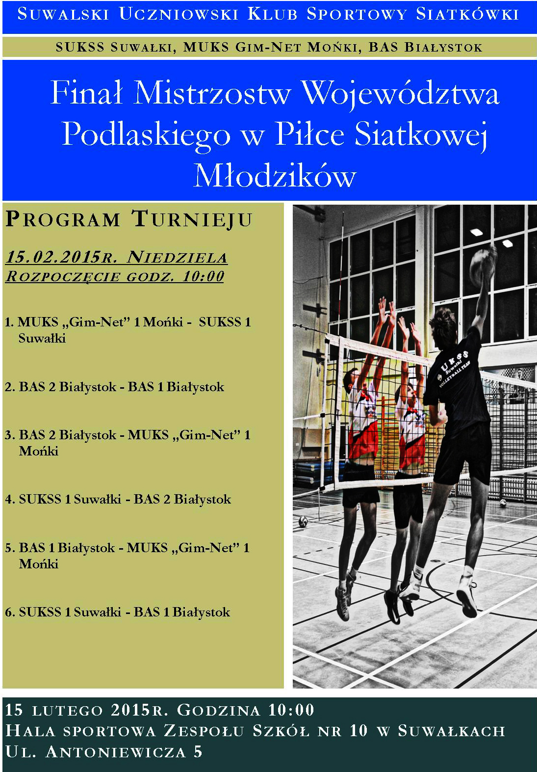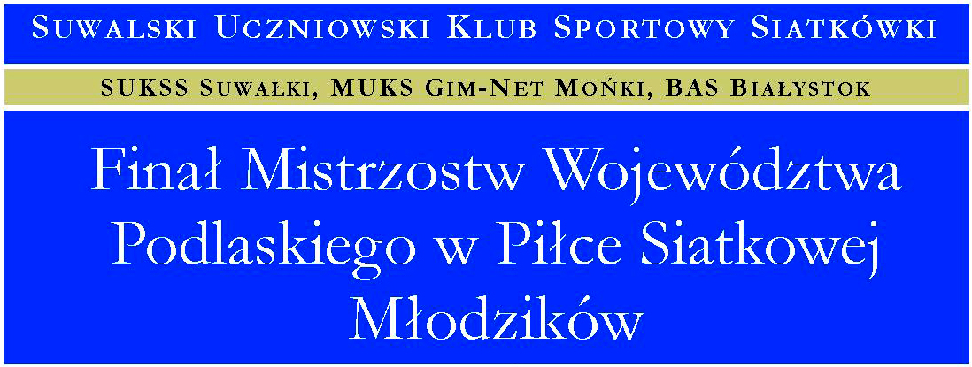 W niedzielę (15.02., godz. 10.00) z udziałem SUKSS Suwałki 1, MUKS GIM-NET Mońki 1, BAS Białystok 1, BAS Białystok 2, w hali sportowej Zespołu Szkół nr 10 w Suwałkach odbędzie się Finał Mistrzostw Województwa Podlaskiego w piłce siatkowej młodzików. Trzy pierwsze drużyny awansują do ćwierćfinału Mistrzostw Polski, a zwycięzca turnieju (21-22.03.) będzie gospodarzem jednego z turniejów ćwierćfinałowych.