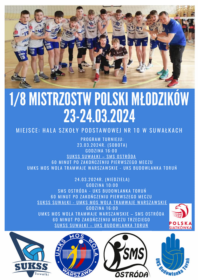 W hali SzkoÅ‚y Podstawowej nr 10 przy ul. Antoniewicza w SuwaÅ‚kach zostanie rozegrany turniej 1/8 Mistrzostw Polski MÅ‚odzików grupa nr 7. Prowadzony przez Marka Klimaszewskiego zespóÅ‚ SUKSS SuwaÅ‚ki kolejno zmierzy siÄ™ w nim z SMS Ostróda, UMKS MOS Wola Tramwaje Warszawskie oraz UKS Budowlanka ToruÅ„.