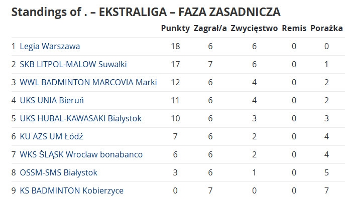 Legia Warszawa – KS Badminton Kobierzyce 7 : 0