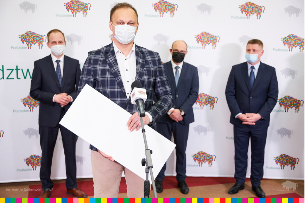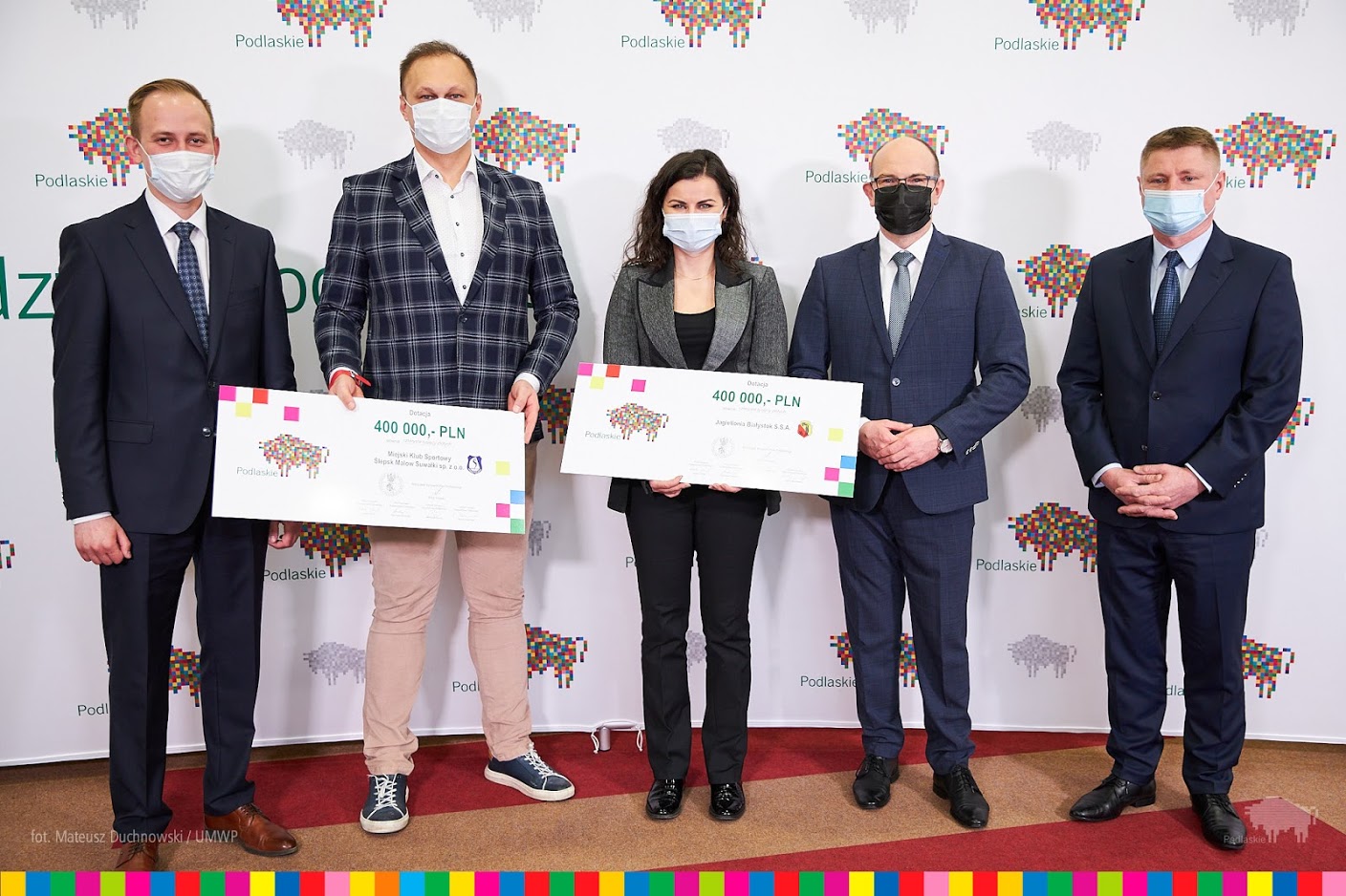 Czołowe kluby sportowe regionu otrzymały po 400 tys. zł dotacji. Marszałek Artur Kosicki oraz Marek Malinowski, członek zarządu, wręczyli symboliczne czeki Agnieszce Syczewskiej, wiceprezes Jagiellonii Białystok i Wojciechowi Winnikowi, prezesowi Ślepska Malowu Suwałki. Samorząd województwa reprezentował także radny Paweł Wnukowski.
