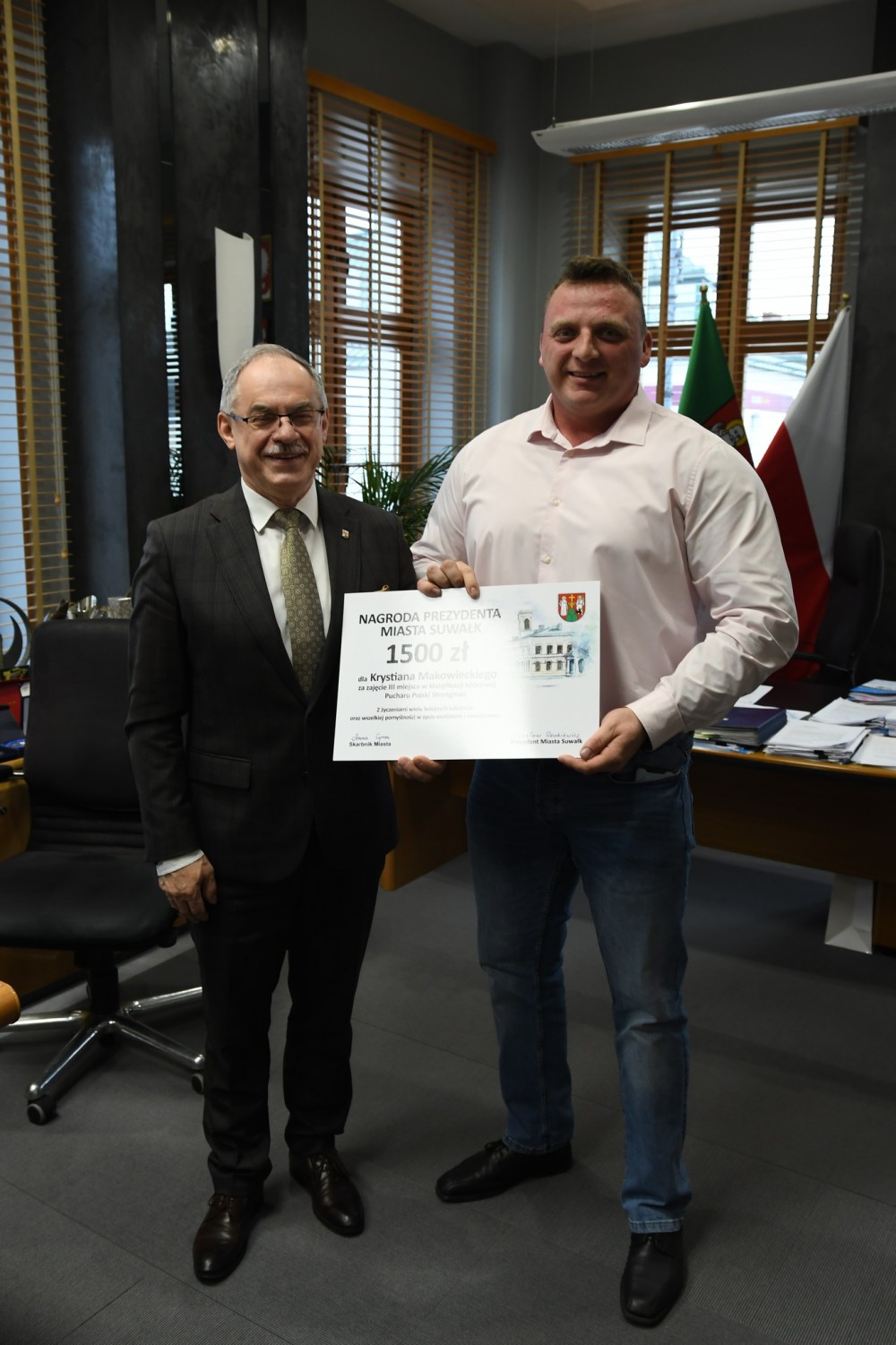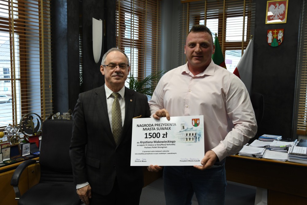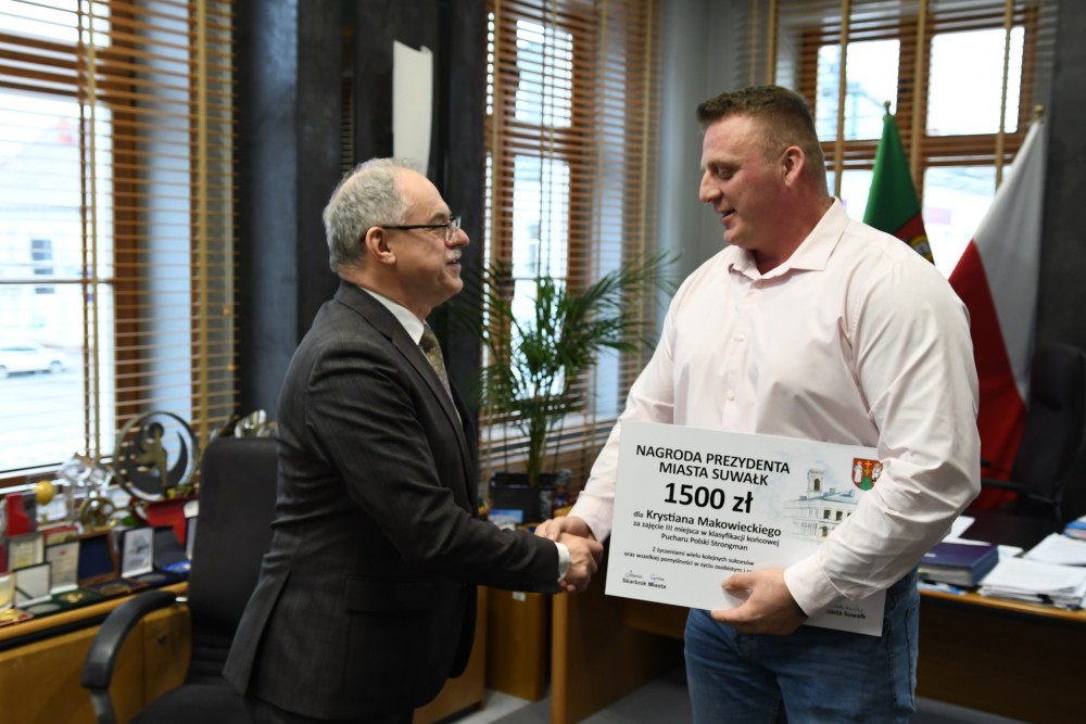 Prezydent Suwałk wręczył Panu Krystianowi nagrodę 1500zł za osiągnięte sukcesy oraz życzył powodzenia w przygotowaniach i starcie w zawodach w Stanach Zjednoczonych.