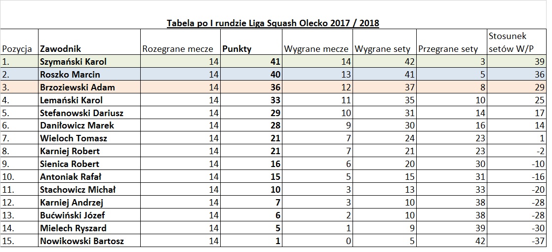 Liga Squash Olecko. Na zakończenie pierwszej rozegrany został mecz o I miejsce. Po blisko godzinnej, wyrównanej walce Karol Szymański pokonał Marcina Roszko 3:2.