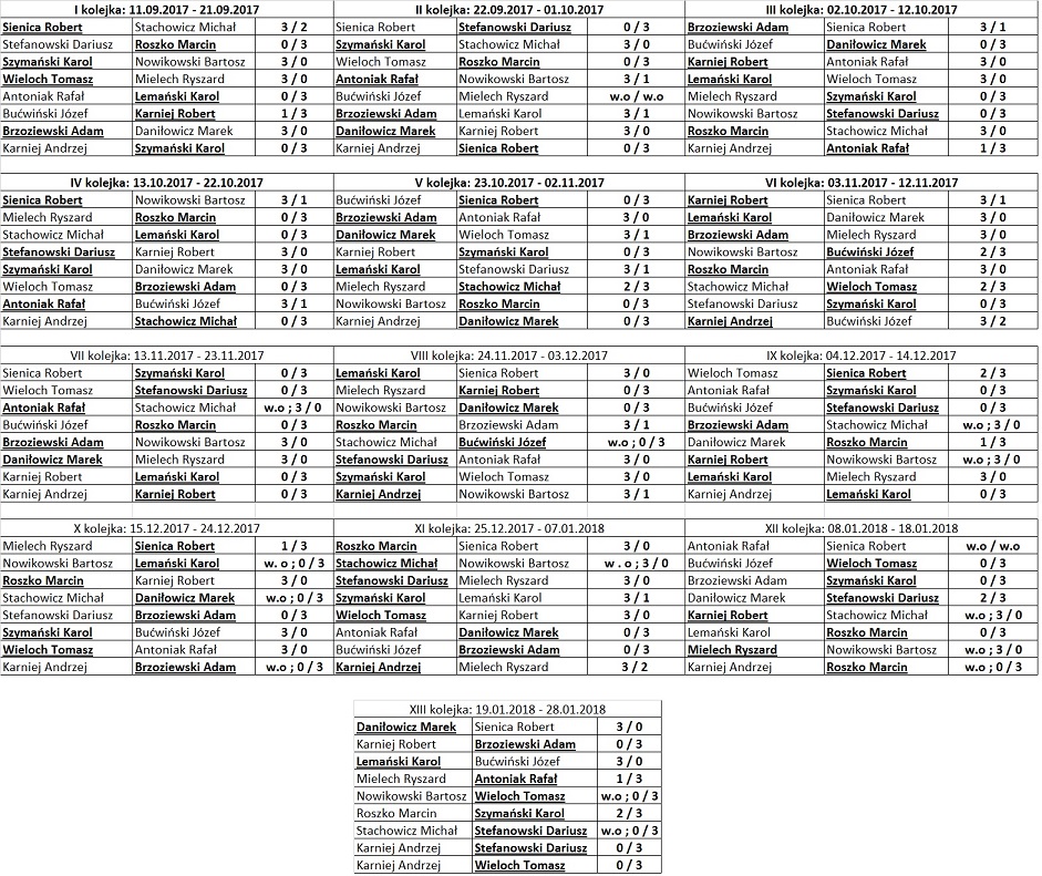 Po I rundzie rozgrywek, z kompletem zwycięstw pierwsze miejsce zajmuje Karol Szymański (Suwałki). Drugi jest Marcin Roszko (Olecko),a trzeci Adam Brzoziewski (Oleckie).