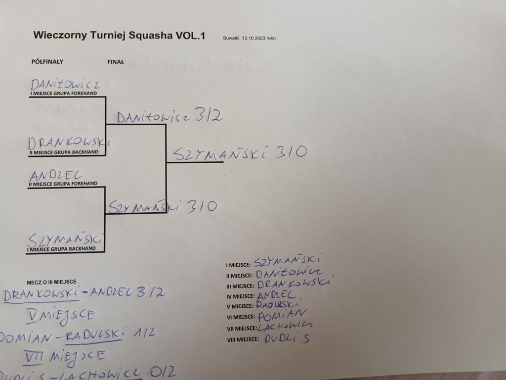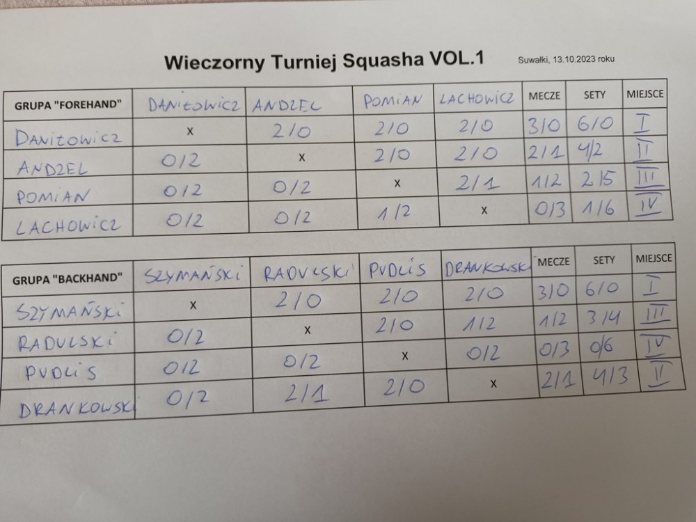 W piątkowy wieczór w Studio Ruchu Suwałki spotkało się 8 sympatyków squasha. Wśród nich czołowi zawodnicy z Suwałk, Olecka i Giżycka. Rywalizowali w dwóch grupach, każdy z każdym.