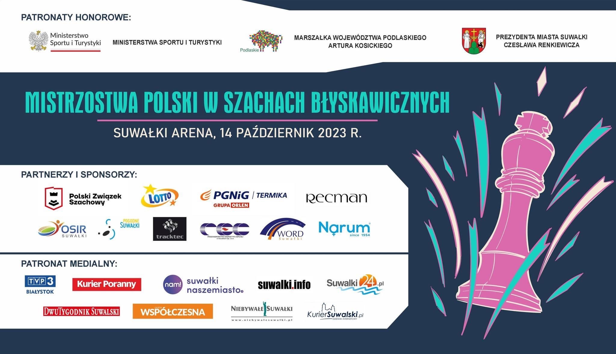 Mistrzostwa Polski w Szachach BÅ‚yskawicznych 2023 rozpocznÄ… siÄ™ w tÄ™ sobotÄ™, 14 października o godz. 10:30 i potrwajÄ… do godz. 18:30. W ramach turniejów indywidualnych bÄ™dzie prowadzona klasyfikacja drużynowa: skÅ‚ady mÄ™skie 4-osobowe i kobiece 3-osobowe. ZwyciÄ™zcy otrzymujÄ… tytuÅ‚y indywidualnego i drużynowego Mistrza Polski w szachach bÅ‚yskawicznych. Organizator gwarantuje pulÄ™ nagród finansowych w minimalnej wysokoÅ›ci 15 000 PLN i 5 000 PLN oraz nagrody rzeczowe.