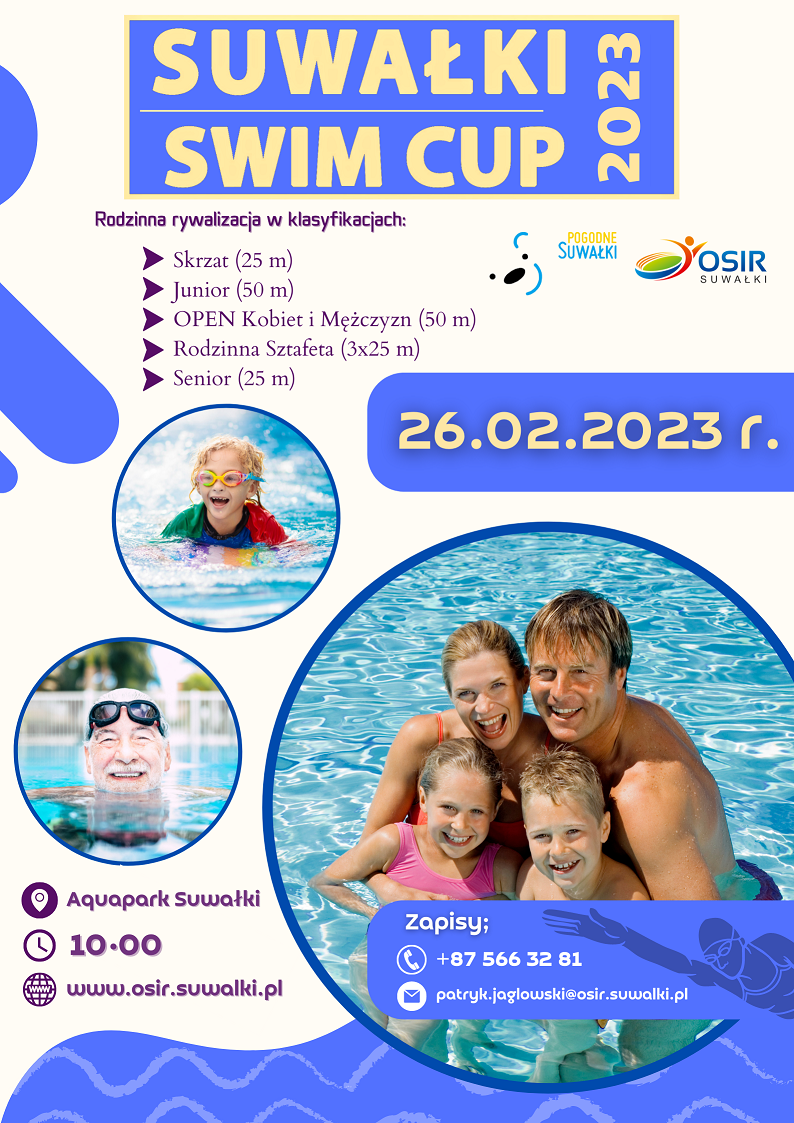 SuwaÅ‚ki Swim Cup to wydarzenie dla miÅ‚oÅ›ników aktywnoÅ›ci w wodzie. Zadaniem zawodników, którzy zadeklarujÄ… swój udziaÅ‚ bÄ™dzie przepÅ‚yniÄ™cie wyznaczonego dystansu w jak najkrótszym czasie. W szczególnoÅ›ci zachÄ™camy do udziaÅ‚u rodziców z dziećmi, ich dziadków, a także caÅ‚e rodziny!