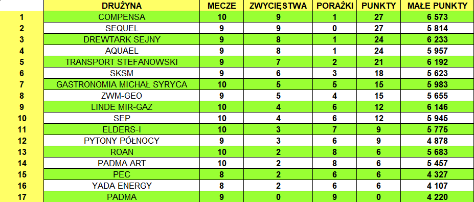 Na czele pozostaje Compensa, która wygraÅ‚a z PEC-em 581:511. Drugi jest Sequel z takÄ… sama liczba punktów, ale jednym rozegranym meczem mniej. Sequel ostatnio zwyciężyÅ‚ ROAN 626:485.