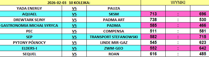 Po feriach zimowych, w kręgielni MK Bowling Suwałki wznowione zostały rozgrywki ligowe. W 10. kolejce zgodnie wygrywały drużyny wyżej notowane w tabeli.