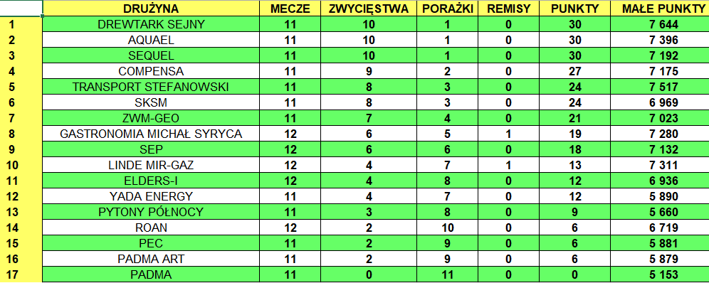 Po 11 kolejkach Compensa miała tyle samo punktów, co trzy plasujące się za nią zespoły, które teraz powygrywały swoje mecze. Nowy lider, Drewtark Sejny w spotkaniu stojącym na wysokim poziomie pokonał ekipę Transportu Stefanowski 764:726. Aquael zwyciężył Eldersów 751: 629, a Sequel wygrał z Pytonami Północy 706:513.
