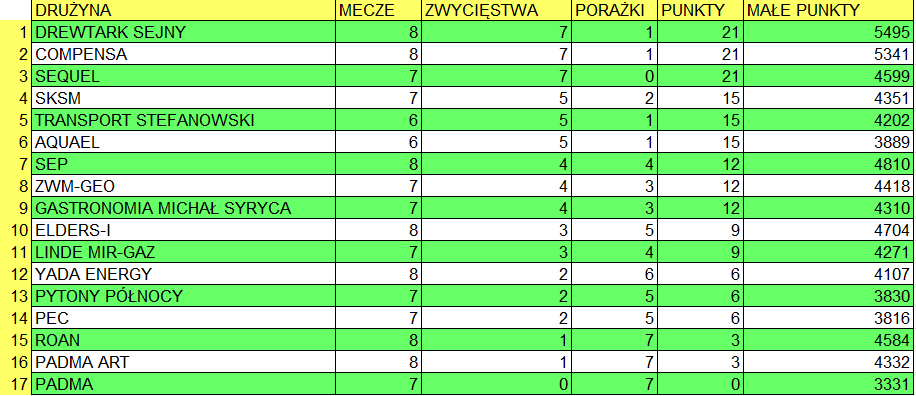 Z siódmego na czwarte miejsce awansowaÅ‚a drużyna Suwalskich Kopalni Surowców Mineralnych. W miniony wtorek Górnicy siÄ™gnÄ™li po 5. zwyciÄ™stwo w sezonie. SKSM wygraÅ‚ z SEP-em 603:523. NajwiÄ™cej punktów dla zwyciÄ™zców zdobyÅ‚ Maciej DÄ…browski – 201, a za nim Wieslaw SzydÅ‚owski – 160, Piotr Wasilewski 125 i Jerzy DÄ…browski – 117. W tym spotkaniu nie wystÄ…piÅ‚ Marcin KonopczyÅ„ski, który byÅ‚ najlepszym zawodnikiem poprzedniej kolejki (231 pkt).