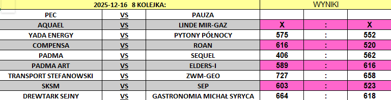 Swój mecz przeÅ‚ożyÅ‚ Aquael, którego zawodnicy reprezentowali Suwalskie Stowarzyszenie Bowlingu na miejskim OpÅ‚atku Sportowca. Także o dwa mecze mniej od wiÄ™kszoÅ›ci pozostaÅ‚ych rozegraÅ‚ Transport Stefanowski, który w spotkaniu stojÄ…cym na bardzo wysokim poziomie pokonaÅ‚ ZWM-Geo 727:658.