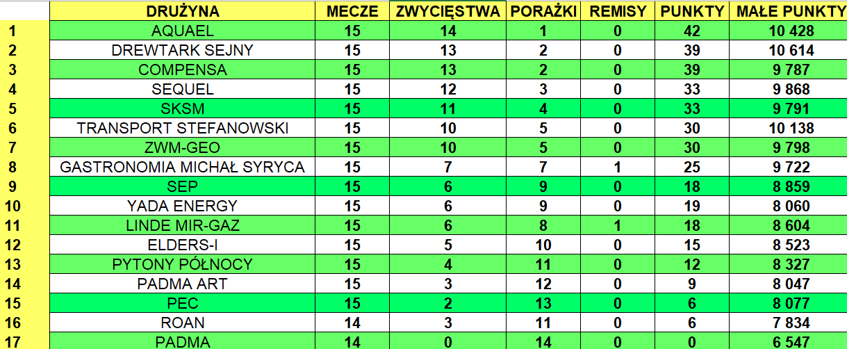 Czwarta pozycję zajmuje Sequel, który wygrał z Padmą Art 661:589. Plasujace się tuż za nim SKSM zwyciężyły Pytonów Północy 695:620.