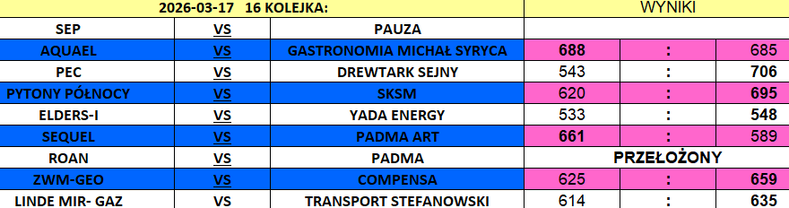 Najbliżej końcowego triumfu jest Aquael, który w zaciętym meczu, różnicą ledwie 5 punktów pokonał Gastronomię Michał Syryca 688:683 i o 3 oczka wyprzedza ścigającą go dwójkę.