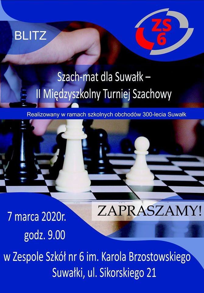 W sobotę o godz. 10.00 w Zespole Szkół nr 6 im. Karola Brzostowskiego w Suwałkach odbędzie się turniej szachowy w ramach szkolnych obchodów 300 Lat Miasta Suwałki.