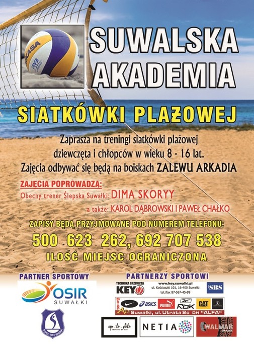 MieszkajÄ…cy na staÅ‚e w GdaÅ„sku byÅ‚y zawodnik rosyjskich i polskich klubów organizuje na lipiec i sierpieÅ„ SuwalskÄ… AkademiÄ™ Siatkówki Plażowej. BÄ™dzie jej gÅ‚ównym trenerem, a pomagać mu bÄ™dÄ… Karol DÄ…browski, byÅ‚y asystent w Åšlepsku SuwaÅ‚ki oraz PaweÅ‚ ChaÅ‚ko, dobrze znany z wystÄ™pów w suwalskich turniejach siatkówki plażowej. Na odpÅ‚atne wakacyjne zajÄ™cia w Akademii szkoleniowcy zapraszajÄ… wszystkie chÄ™tne dziewczÄ™ta i chÅ‚opców w wieku od 8 do 16 lat. Pierwszy, „próbny”, trening jest darmowy.