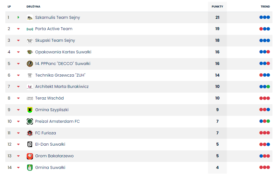 W ósmej kolejce spotkań trzecia w tabeli Porta Active Team pokonała Opakowania Kartex 4:0 i zepchnęła je z pozycji wicelidera. Z piątego na trzecie miejsce awansował Skupski Team Sejny.