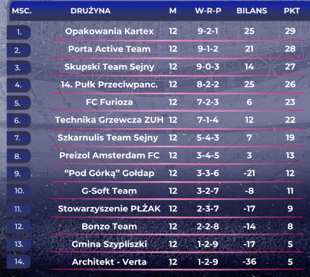Teraz, w hicie kolejki 14 Pułk Przeciwpancerny zmierzy się z liderem, Opakowaniami Kartex, który bardzo pewnie pokonał G-Soft Team 4:1. Za zwycięstwo żolnierzy lub remis trzymają kciuki piłkarze zajmującej drugie miejsce Porty Active Team, którzy wygrali z Gmina Szypliszki 4:2 oraz trzeci w tabeli Skupski Team, który w derbach Sejn zwyciężył ekipę Szkarnulisa 4:1.