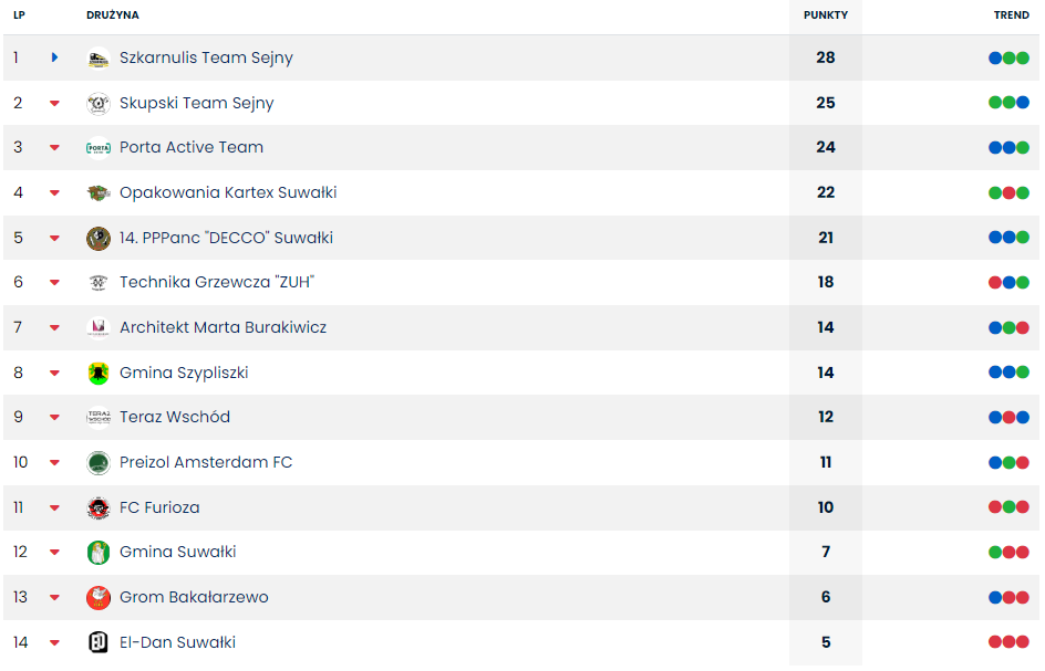 Aktualnie w zestawieniu generalnym prowadzi drużyna Szkarnulis Team Sejny (28 pkt.), której kapitan Piotr Leszczyński piastuje pozycję lidera klasyfikacji najlepszych asystentów sezonu. Rywalizacja w górnej części tabeli jest bardziej zacięta niż kiedykolwiek wcześniej. Podium dopełniają zespoły: Skupski Team Sejny (25 pkt.) i Porta Active Team (24 pkt.). W walce o strefę medalową pozostają ponadto: Opakowania Kartex Suwałki (22 pkt.), 14. Pułk Przeciwpancerny „DECCO” Suwałki (21 pkt.) i Technika Grzewcza „ZUH” (18 pkt.). Kibice jak i sami gracze nie mogą doczekać się zakończenia emocjonujących zmagań i poznania zwycięzcy.