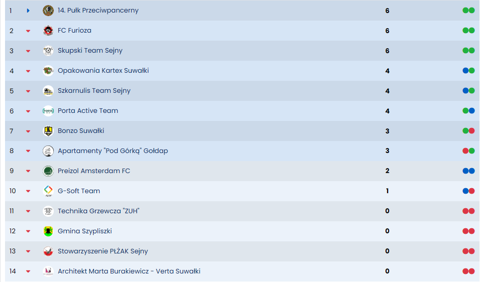 Po drugiej kolejce spotkań mamy 6 niepokonanych drużyn, w tym 3 mogące pochwalić się kompletem punktów. Przodownictwo w tabeli utrzymują żołnierze 14 Pułku Przeciwpancernego, którym kroku dotrzymują FC Furioza i Skupski Team Sejny.