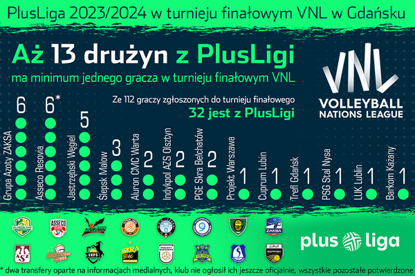 Co ciekawe, aż trzynaÅ›cie zespoÅ‚ów z PlusLigi ma w finaÅ‚ach Ligi Narodów minimum jednego swojego gracza. NajwiÄ™cej – bo po szeÅ›ciu – majÄ… Grupa Azoty ZAKSA KÄ™dzierzyn-Koźle i Asseco Resovia Rzeszów (dwa transfery jeszcze nie zostaÅ‚y oficjalnie potwierdzone – przyp. red.), piÄ™ciu JastrzÄ™bski WÄ™giel, trzech Åšlepsk Malow SuwaÅ‚ki, po dwóch Aluron CMC Warta Zawiercie, Indykpol AZS Olsztyn i PGE Skra BeÅ‚chatów, a po jednym Projekt Warszawa, Cuprum Lubin, Trefl GdaÅ„sk, LUK Lublin, Barkom Każany Lwów i PSG Stal Nysa. W turnieju biorÄ… udziaÅ‚ także trenerzy z PlusLigi, Javier Weber w sztabie USA i Marcelo Mendez jako selekcjoner ArgentyÅ„czyków.