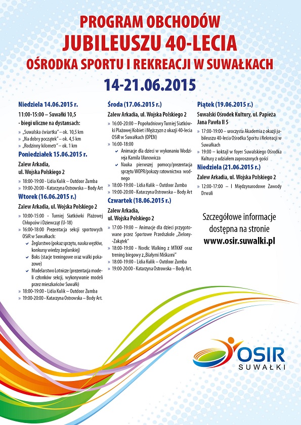 Najpierw niedzielne biegi uliczne, a potem OSiR, który ma nowe logo a na poczÄ…tku czerwca uruchomi nowÄ… stronÄ™ internetowÄ…, dla mieszkaÅ„ców SuwaÅ‚k oraz miÅ‚oÅ›ników sportu z kraju i zagranicy od poniedziaÅ‚ku, 15 do czwartku, 18 czerwca przygotowaÅ‚ szereg imprez i zajęć. Część z nich, jak zumba i fitness body art, treningi biegowe czy korzystanie ze sprzÄ™t pÅ‚ywajÄ…cego bÄ™dzie bezpÅ‚atne, za póÅ‚ ceny bÄ™dzie można popÅ‚ywać w Aquaparku czy powspinać siÄ™ na Å›ciance w hali. Prezentować siÄ™ bÄ™dÄ… przedstawiciele dziaÅ‚ajÄ…cych w OSIR-ze sekcji, bÄ™dÄ… turnieje siatkówki plażowej, pokazy ratownictwa wodnego, konkursy i zabawy dla dzieci i dorosÅ‚ych. O tych wszystkich wydarzeniach bÄ™dziemy szczegóÅ‚owo informować w miarÄ™ zbliżania siÄ™ terminów.