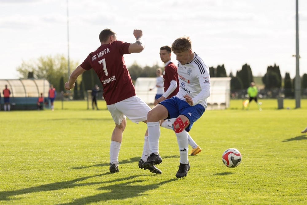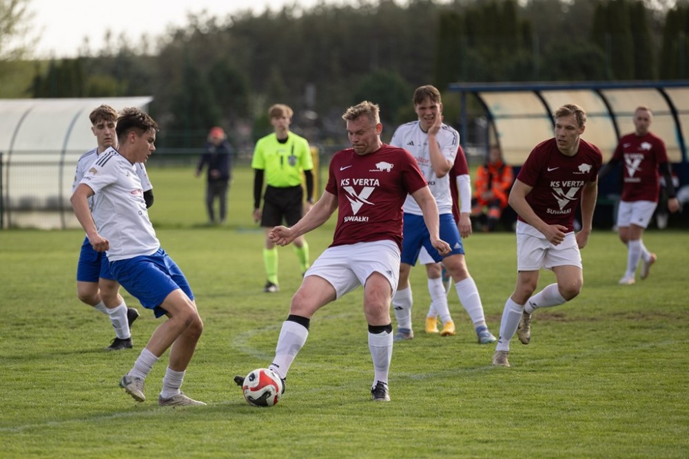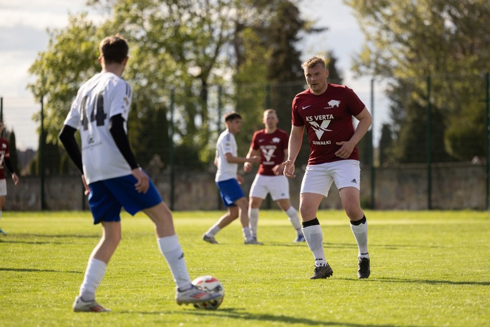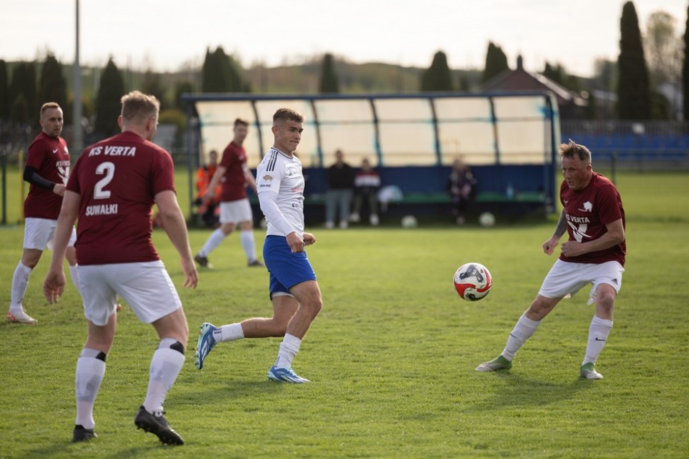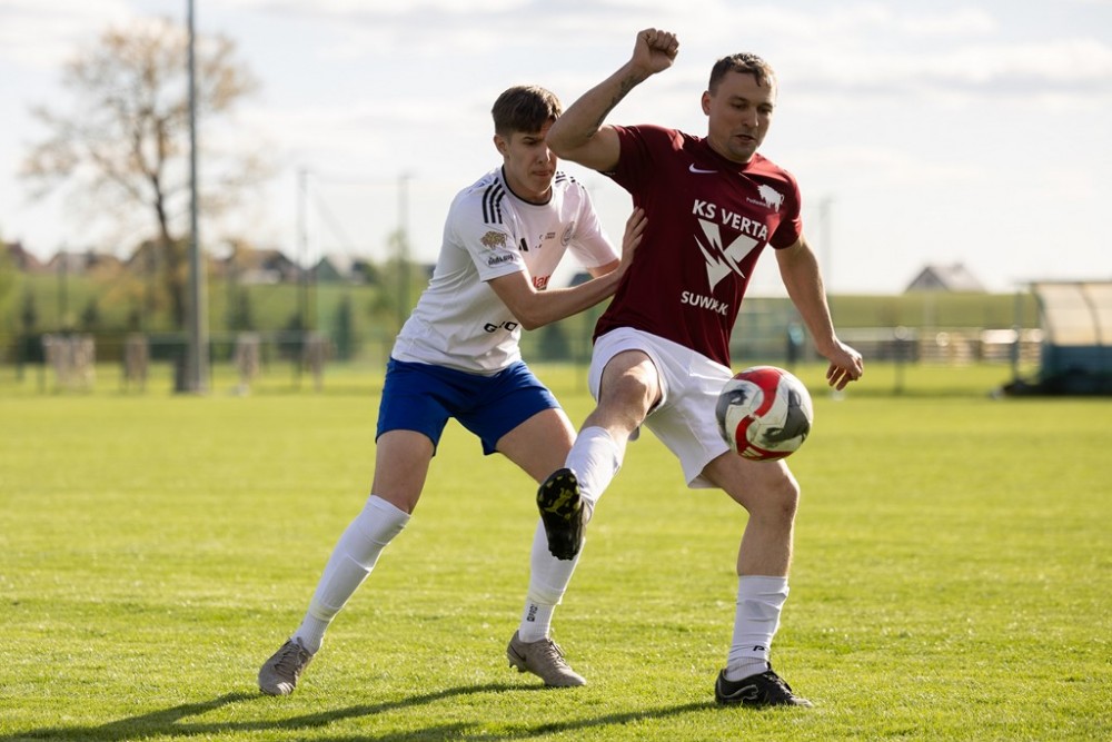 Nie było niespodzianki w derbach A Klasy na Zarzeczu (na zdjęciach). Lider, Wigry II Suwałki wysoko wygrały z przedostatnią w tabeli Vertą Suwałki.