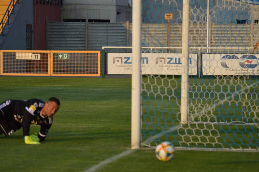 Po półgodzinie gry Wigry strzeliły wreszcie gola, ale po stalym fragmencie - po rzucie karnym. Wbiegający w "16" Robert Barczak po kontakcie z obrońcą gości padł jak ścięty i arbiter pokazał na "wapno".