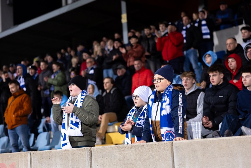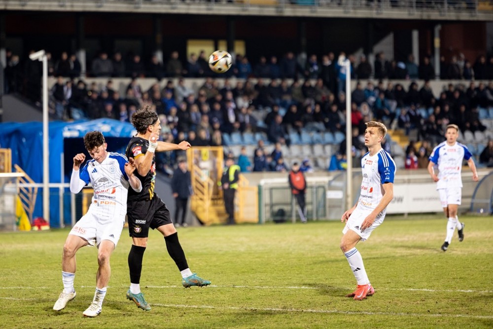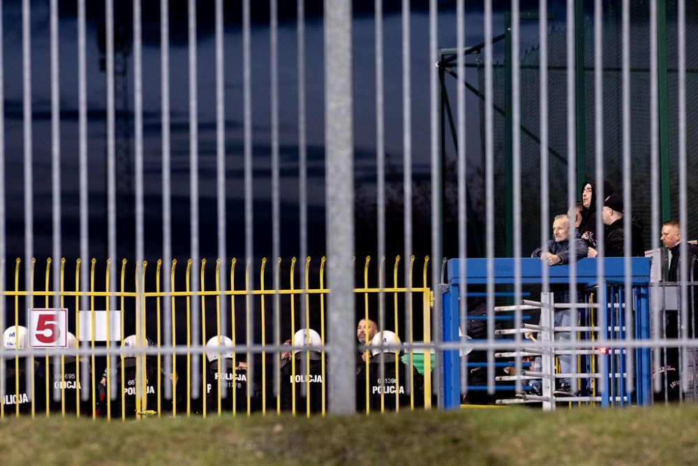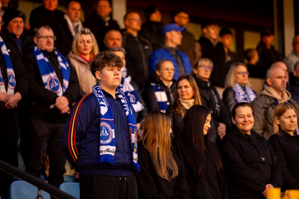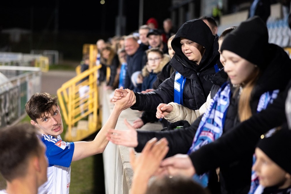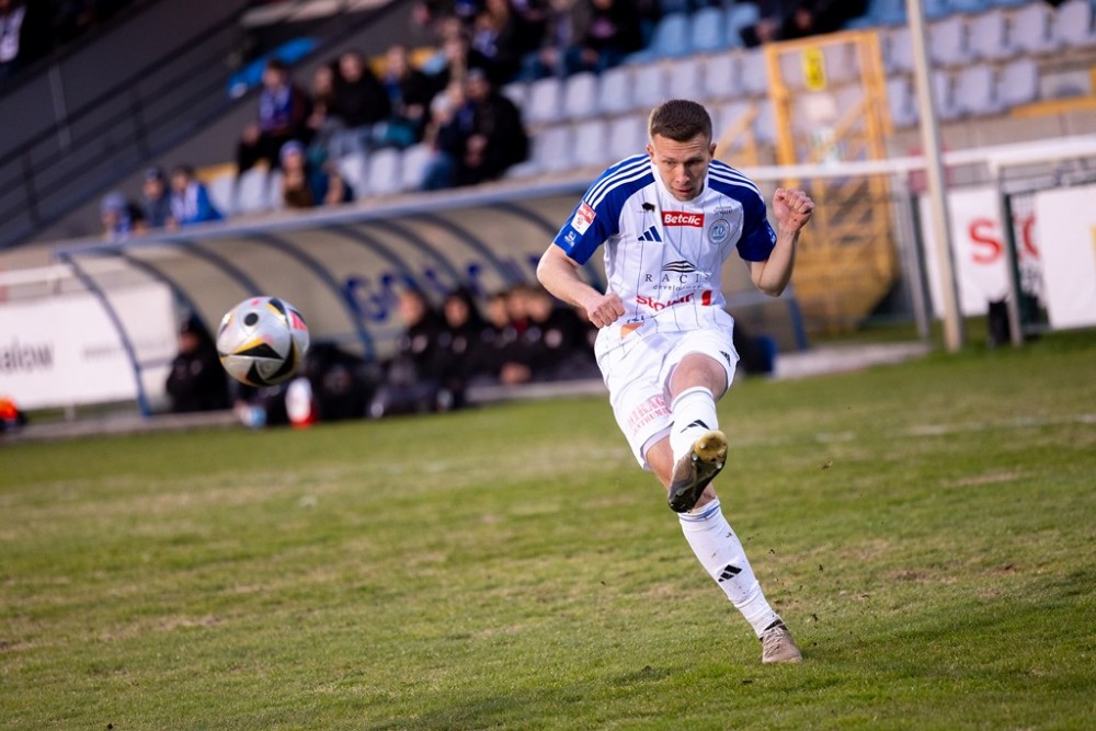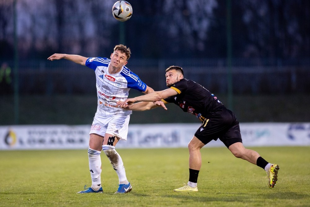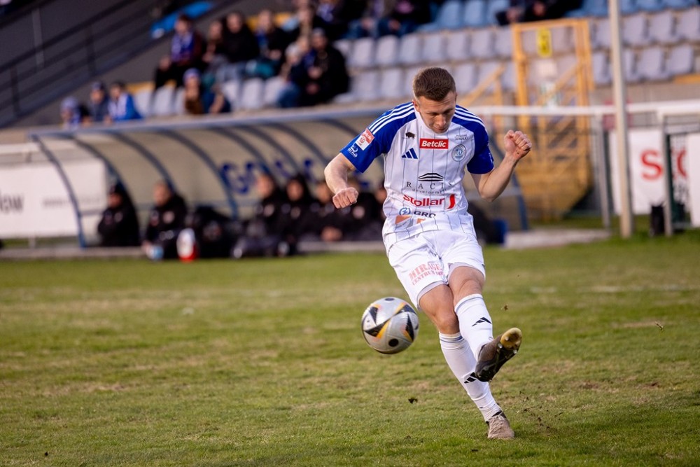 Świadomi tej stawki Biało-Niebiescy znakomicie rozpoczęli spotkanie. Przycisnęli gości i po kwadransie powinni byli prowadzić trzema bramkami. Najpierw po strzale głową Mateusza Machały pilka trafiła w słupek, potem Bartosz Guzdek nieczysto uderzył z 5 metrów, a Kacper Głowicki z ostrego kąta przeniósł piłkę nad poprzeczką. Po drugiej stronie boiska, najskuteczniejszy gracz Betclic 3 Ligi Hubert Antkowiak strzelił kąśliwie, ale niecelnie, następnie strzał Stromeckiego został zablokowany.