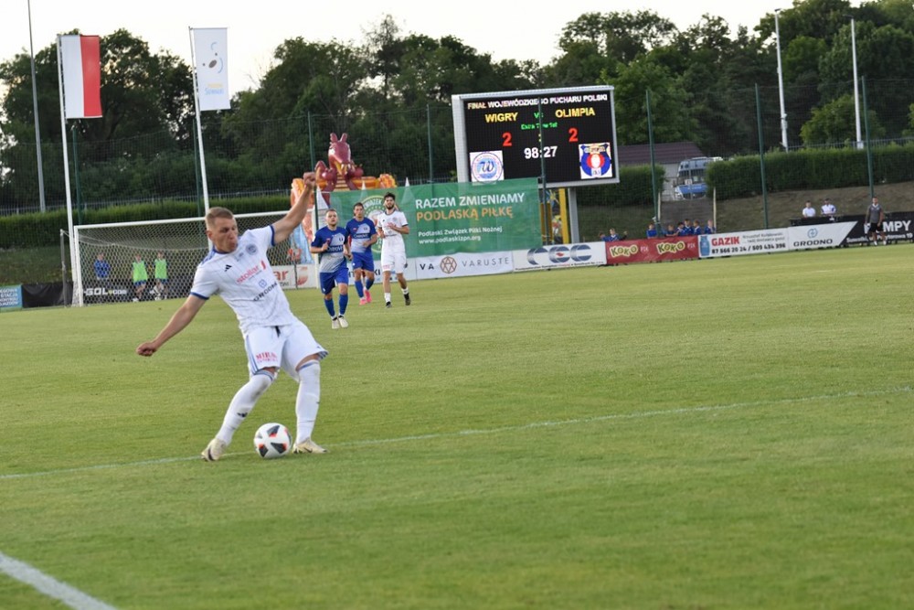 Dramatyczny, pełen zwrotów akcji, rozstrzygnięty dopiero w dogrywce mecz był godny finału Wojewódzkiego Pucharu Polski. Czwartoligowe Wigry przed własną, szalejącą publicznością pokonały trzecioligową Olimpię Zambrów, a za trzy dni same chcą przypieczętować awans do III ligi.