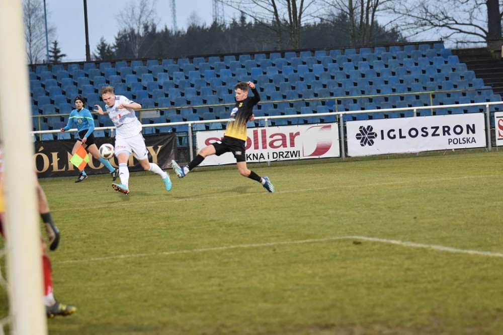 Suwalczanie nie pozwalali gościom wyjść poza 30. metr i ćwiczyli z jednej bądź drugiej strony dośrodkowania obowiązkowo kończone strzałem z woleja. Nie dziwi, ze każdy kolejny gol był coraz piękniejszy. W 10 minucie jeszcze nie wyszło po wrzutce Macieja Makuszewskiego do Bartosza Gużewskiego, ale już 3 minuty później Kacper Głowicki do gola dodał asystę. Jego dośrodkowanie na bliższy słupek uderzeniem z powietrza pod poprzeczkę na 2:0 zamienił Filip Kozłowski. Jesienią grał on na prawym stoperze, teraz pełni rolę pomocnika.