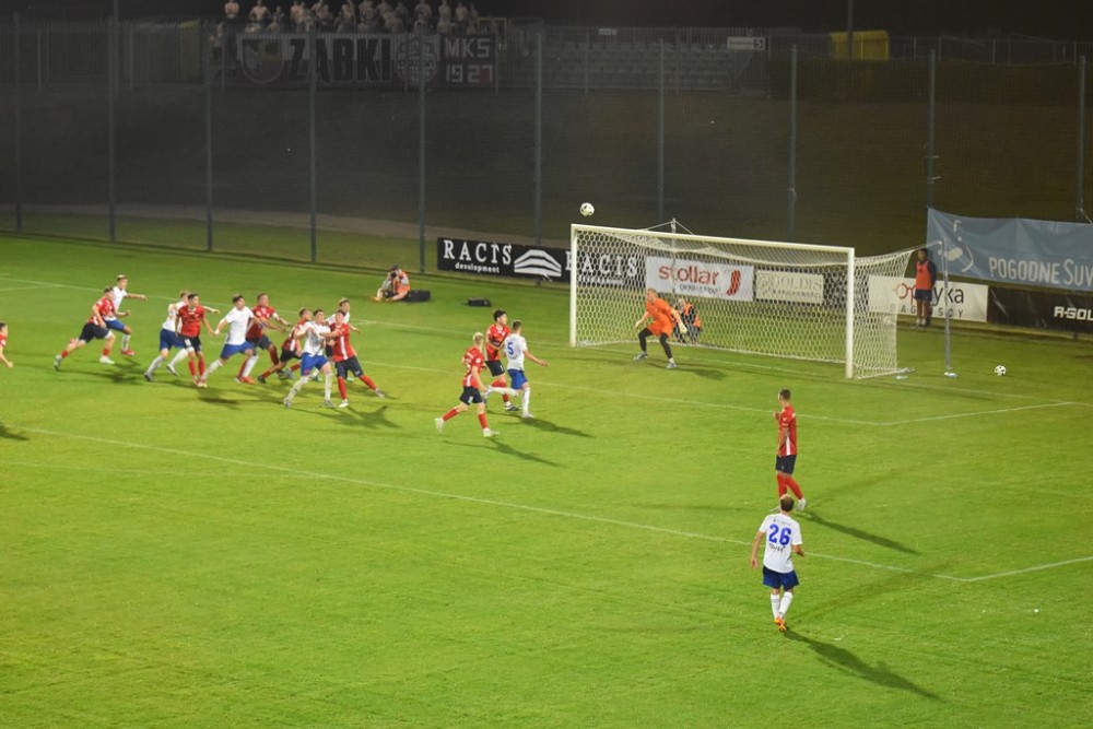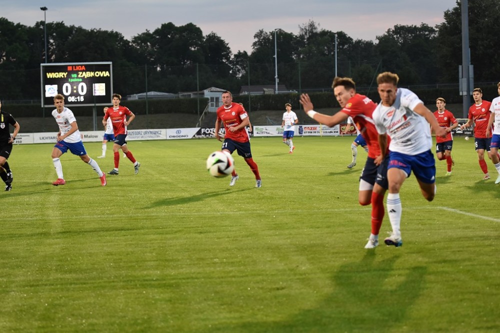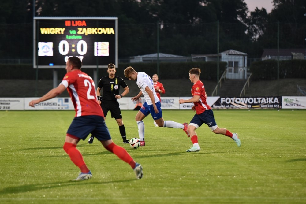 Zwłaszcza przez pierwszy kwadrans gospodarze głównie przyglądali się poczynaniom beniaminka z Ząbek, który po wygranej na inaugurację z Mławianką Mława 6:2, został liderem Grupy I Betclic 3 Ligi. Wigry przed tygodniem na wyjeździe uległy rezerwom Jagiellonii 1:3 i teraz miały dać z siebie wszystko, by zadowolić licznych kibiców, którzy po trzyletniej przerwie zasiedli także na odkrytej trybunie.