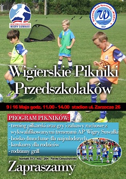 Gry oraz szereg atrakcji zorganizowaÅ‚a najmÅ‚odszym adeptom futbolu Akademia PiÅ‚karska Wigry SuwaÅ‚ki, do której uczÄ™szczajÄ… nawet piÄ™ciolatkowie. Wkrótce ogÅ‚osi ona nabór do grup szkoleniowych, a wczeÅ›niej – już w tÄ™ sobotÄ™ w godz. 11-14 zaprasza wszystkich chÄ™tnych przedszkolaków do udziaÅ‚u w kolejnym pikniku.