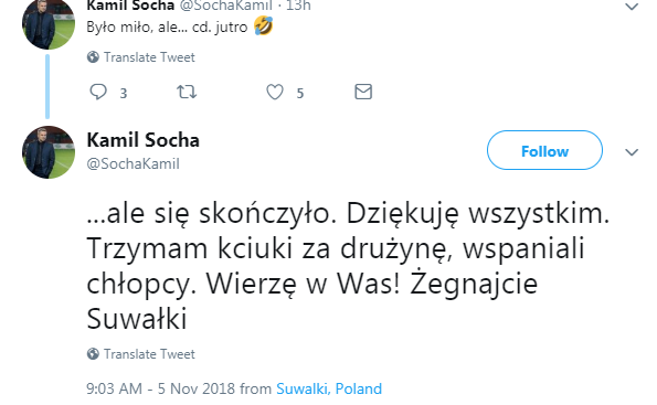 W niedzielę trenerem suwalskich Wigier przestał być Kamil Socha. Powodem jego rozstania z pierwszoligowcem jest to, iż od dziewięciu kolejek drużyna nie wygrała meczu i z 4. miejsca spadła na 13., ma cztery punkty przewagi nad strefą spadkową.