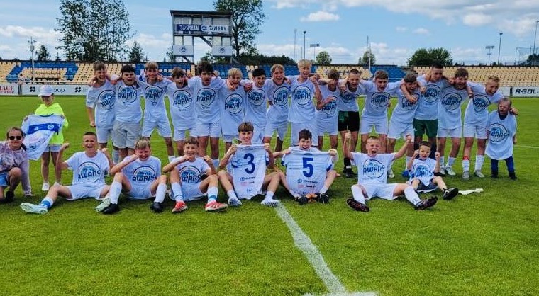Na najwyższy szczebel rozgrywek w tej kategorii wieku Biało-Niebiescy dostali się dzięki zdobyciu w czerwcu Mistrzostwa Województwa przez drużynę trampkarzy C2 (na zdjęciu), prowadzoną przez Damiana Sobolewskiego i Tomasza Jarząbskiego. Ubył z niej Mateusz Kubas, który będzie grał w Jagiellonii Białystok.
