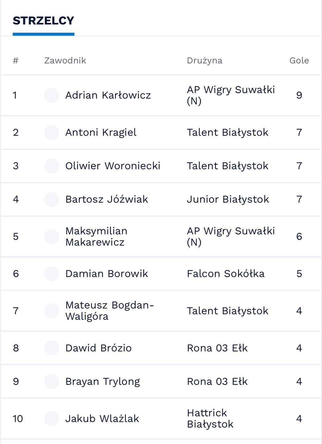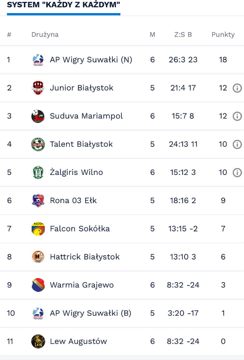 ZespoÅ‚y, w których wystÄ™pujÄ… także dziewczÄ™ta, grajÄ… systemem każdy z każdym. Po pierwszym dniu prowadzÄ… gospodarze z Akademii PiÅ‚karskiej Wigry SuwaÅ‚ki, którzy w szeÅ›ciu meczach zdobyli komplet punktów. W klasyfikacji najskuteczniejszych prowadzi suwalczanin Adrian KarÅ‚owicz.