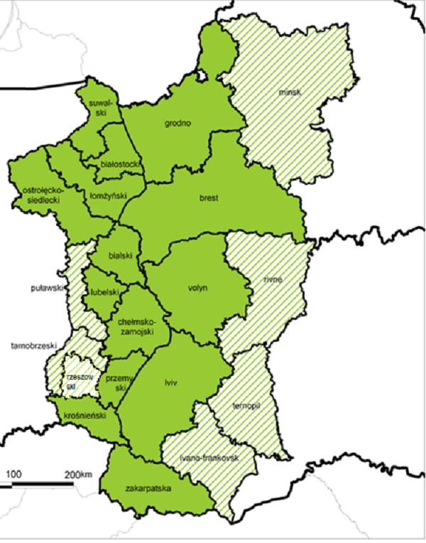 - po stronie ukraińskiej - obwody lwowski, wołyński, zakarpacki.