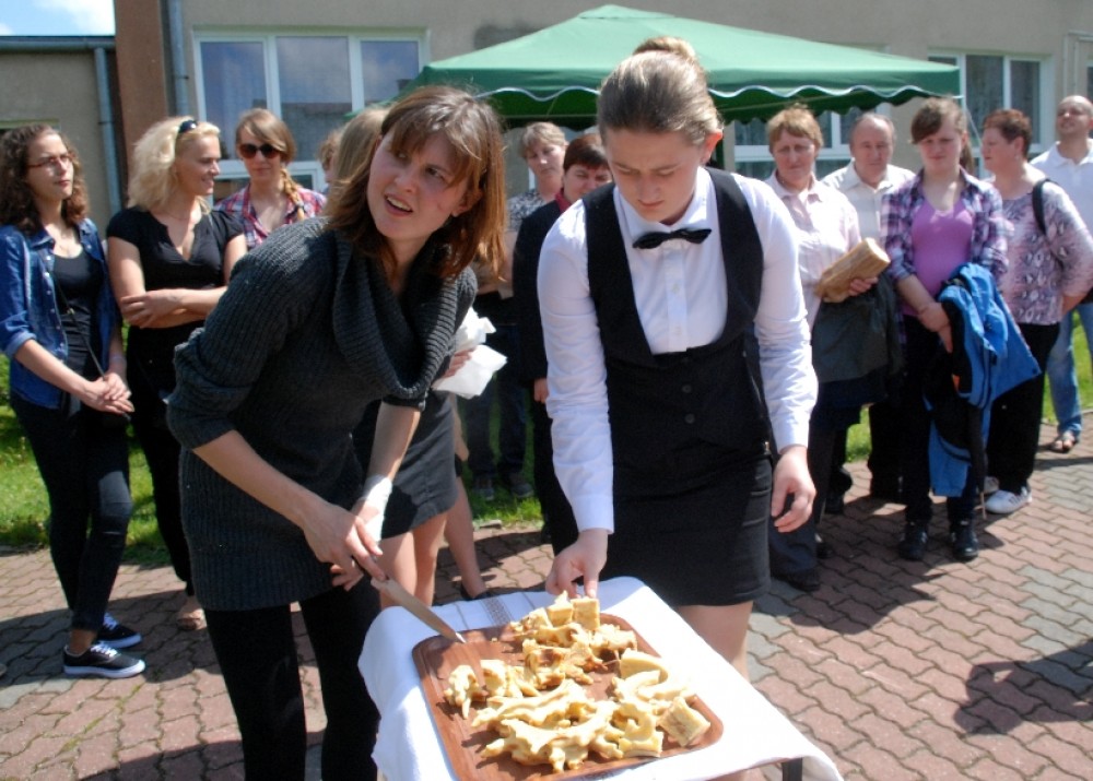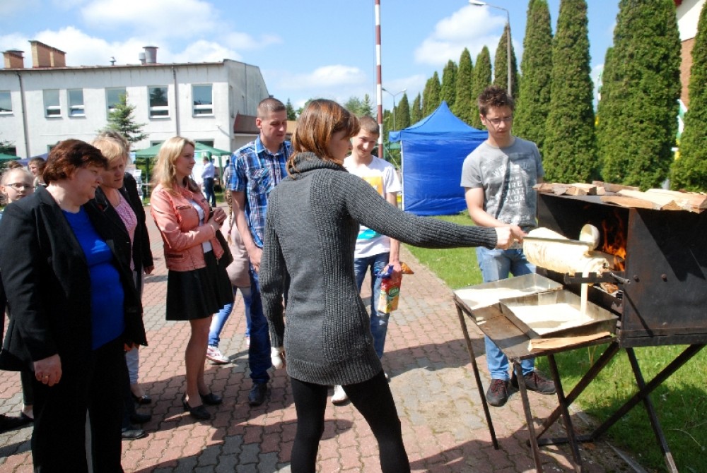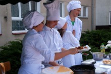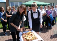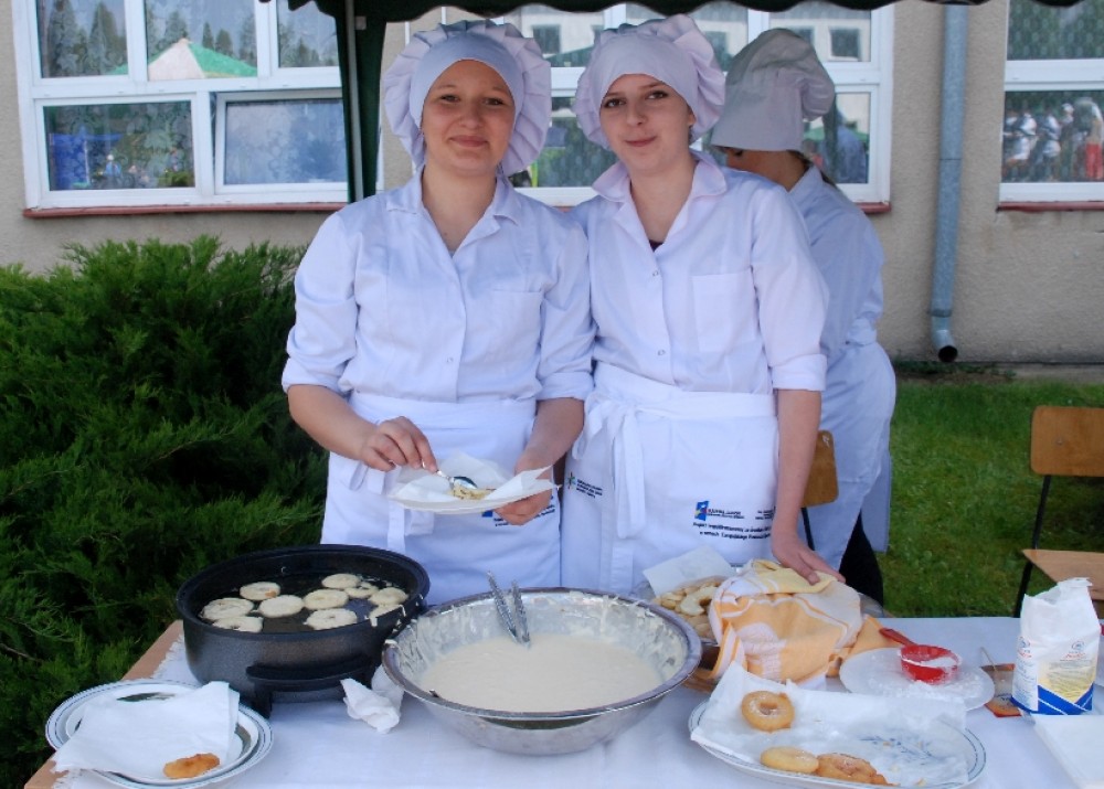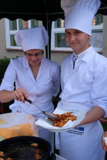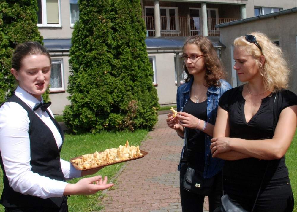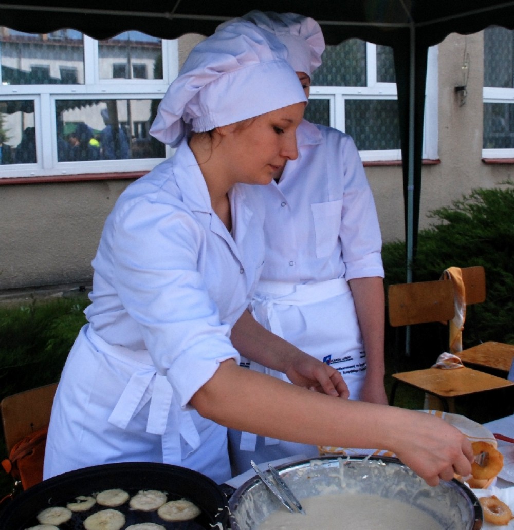 Umiejętności kulinarne zdobyte w pierwszym roku nauki pokazali uczniowie z klasy o żywienie i specjalności gospodarstwo domowe oferując pieczone na oczach widzów chrusty i obwarzanki z nadzieniem z jabłek. Pyszne, że palce lizać.