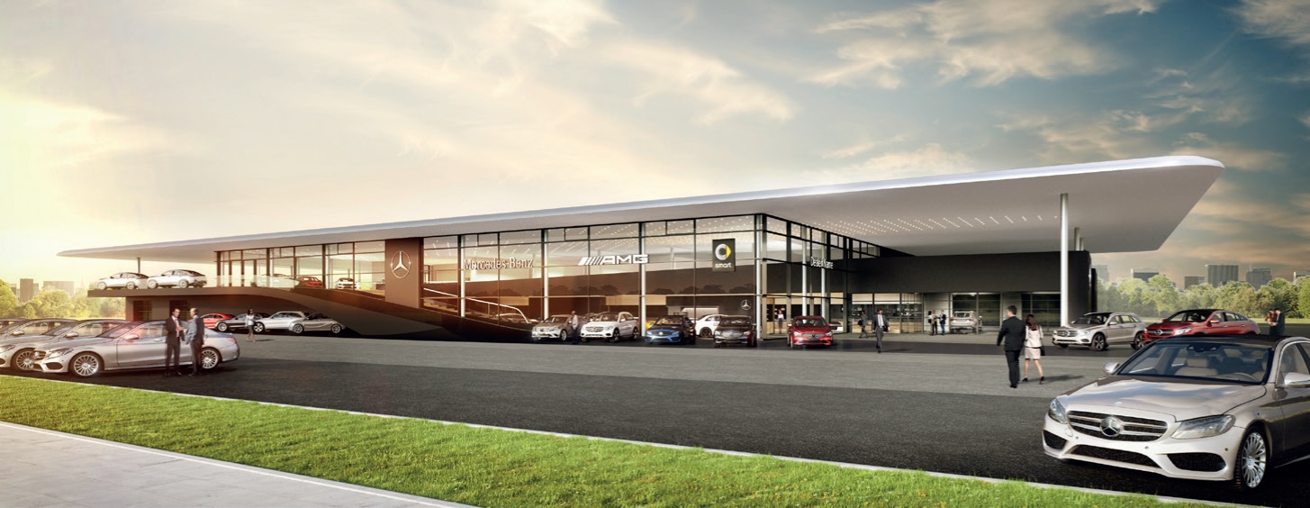 Na wizualizacji prezentujemy nowy standard salonów Mercedesa.