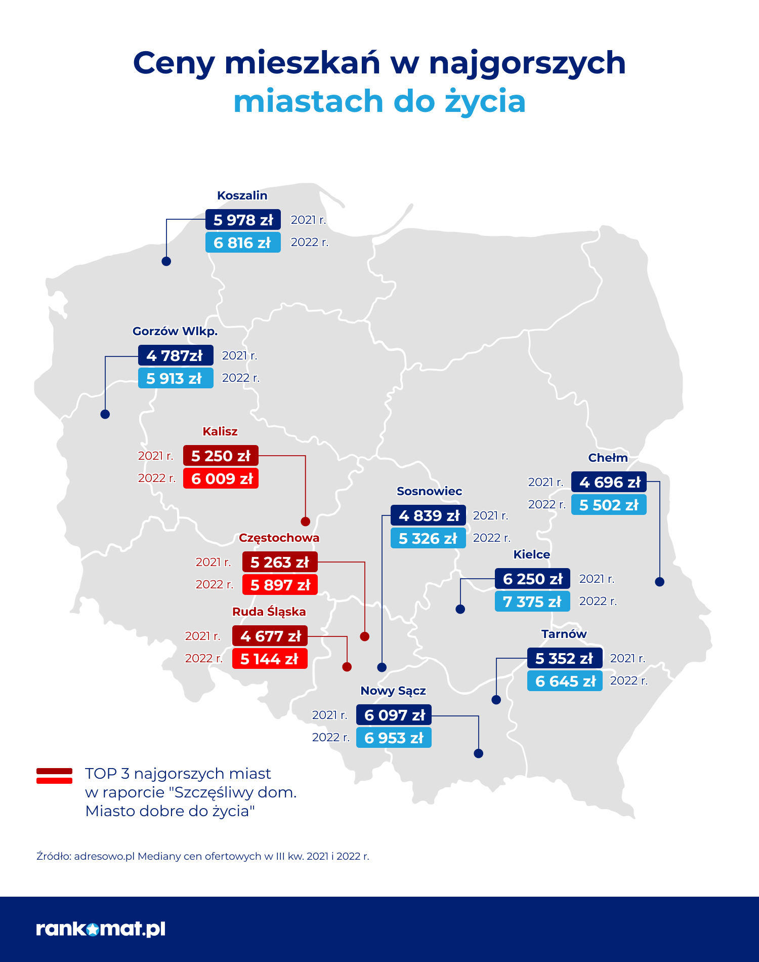 W miastach uznanych w raporcie przez ich mieszkańców za najgorsze do życia zostają na pocieszenie umiarkowane ceny mieszkań. Najdrożej za 1m2 mieszkania z rynku wtórnego trzeba zapłacić w Kielcach (7375 zł), Nowym Sączu (6953 zł) i Koszalinie (6816 zł) – według adresowo.pl za III kw. 2022 r.
