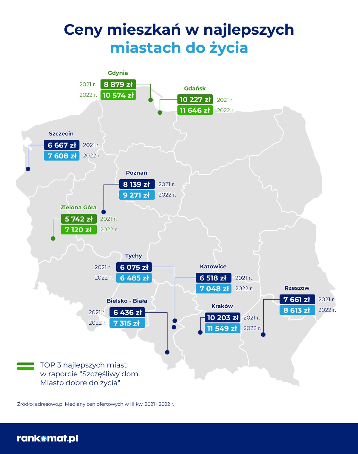 Pod względem cen mieszkań w miastach uznanych w raporcie „Szczęśliwy dom. Miasto dobre do życia” Think Co i portali Otodom za najlepsze trzeba przygotować się na wydatek nawet ponad 11 000 zł za 1m2. Tak jest w Gdańsku i Krakowie, a niewiele taniej w Gdyni. Najtańsze w zestawieniu najlepszych miast do życia są Tychy, gdzie 1m2 jest oferowany w cenie 6485 zł - wynika z danych na adresowo.pl za III kw. 2022 r.